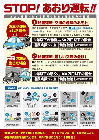 改正道交法は、あおり運転の罰則を3年以下の懲役または50万円以下の罰金とし、著しい危険があった場合は5年以下の懲役または100万円以下の罰金と規定している。バイクや自転車の運転のほか、ドライバーをそそのかしたり、手助けした同乗者らも摘発や行政処分の対象となる。【町田徳丈】