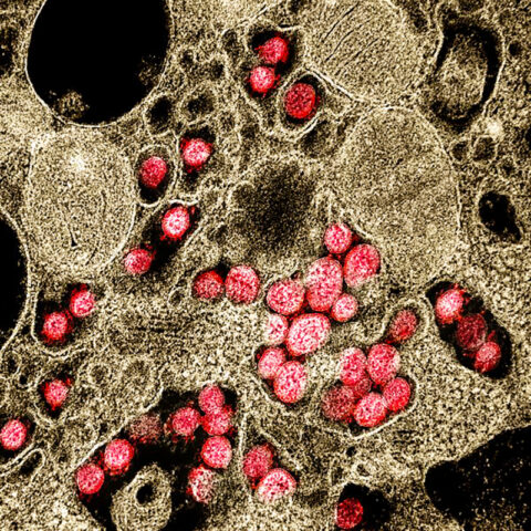 환자로부터 분리된 SARS-CoV-2 바이러스 입자의 투과전자현미경 사진. ©NIAID