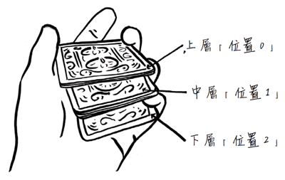 唯一的差別是有時你可以把指出的那疊牌放在最上面或最下面,而不是每次都放在中間。為了找出它在哪裡,就把疊在最上面稱為位置0,中間位置稱為1,最下面稱為2,然後只要把你想擺在自願者的牌上方的牌數轉換成三進位。第一次重組三疊牌的位置時,根據1的數目把指出的牌放進位置0、1或2,第二次就依據3的數目,而第三次依據9的數目;因此,如果你想把七張牌放在自願者選出的牌的上方,7的三進位表示是021(它有零個9,兩個3,一個1),於是就按照這個順序(從1開始倒過來進行)把指出的那疊放在中間、最下面及最上面。在魔術終了,你從最上面數七張牌拿走,在第八個位置的下一張就是自願觀眾所選出的牌。