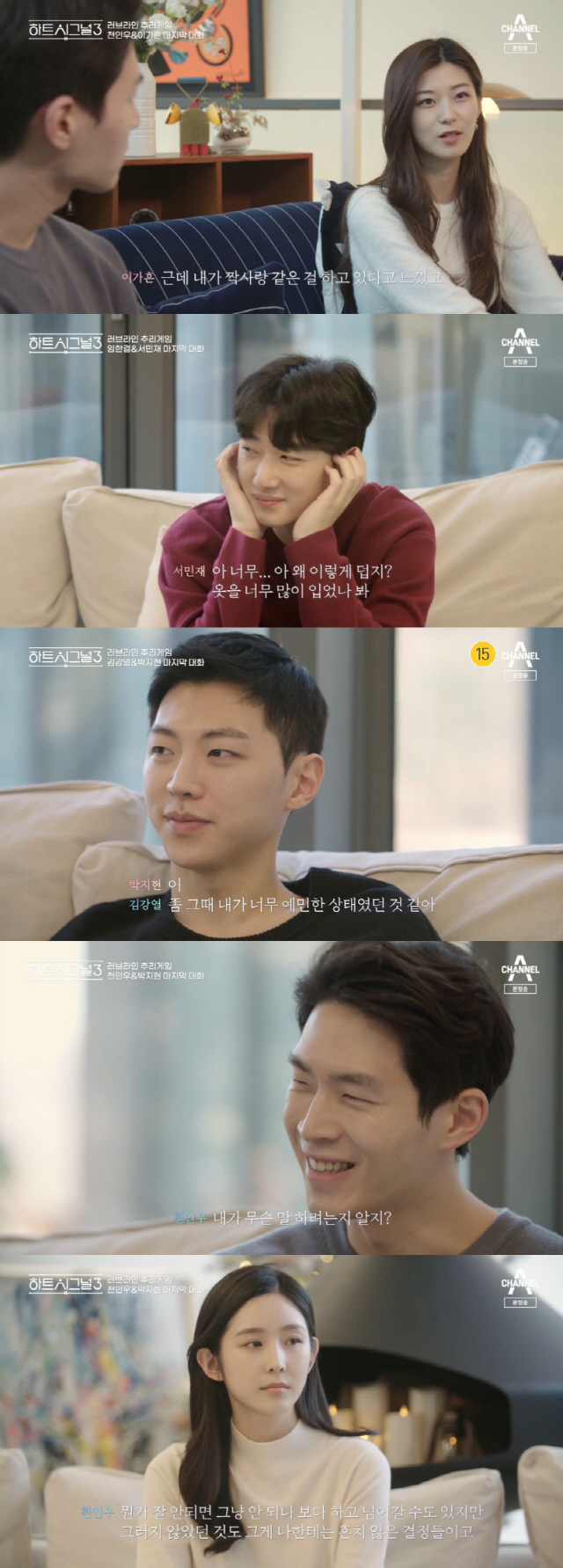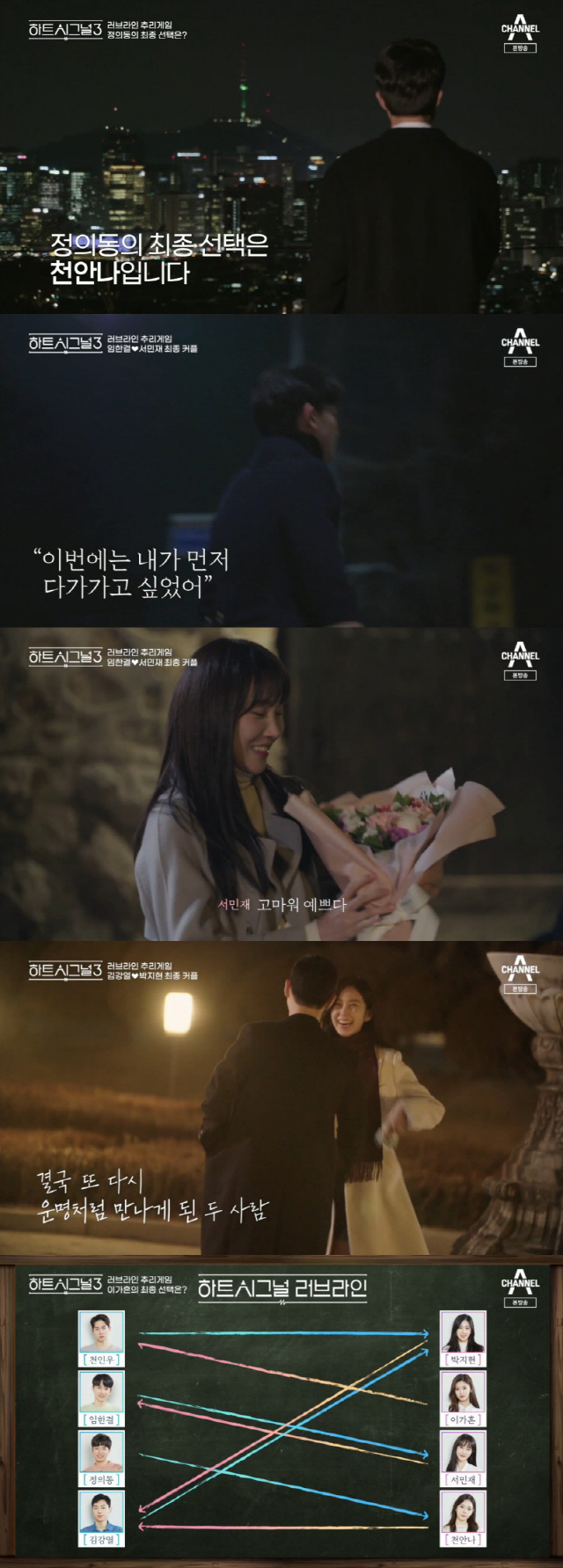 8일 방송된 채널A 예능프로그램 '하트시그널3'에서는 시그널하우스 입주자들의 마지막 선택이 그려졌다. 제주도 여행을 마치고 돌아와 묘한 기류를 보였던 이들의 선택에 관심이 집중됐다.