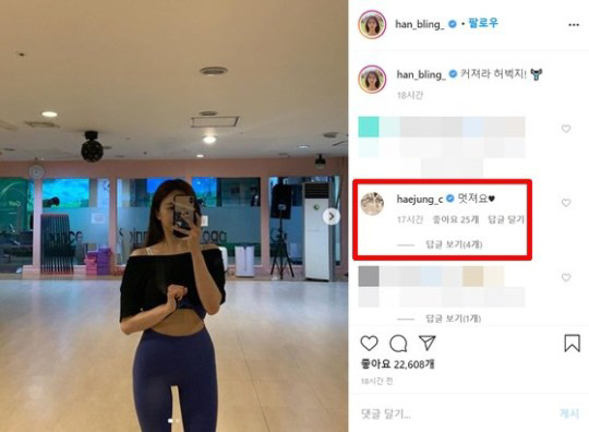 조혜정은 21일 한보름의 SNS 사진에 "멋져요"라는 짧은 댓글을 달아 화제가 됐다.