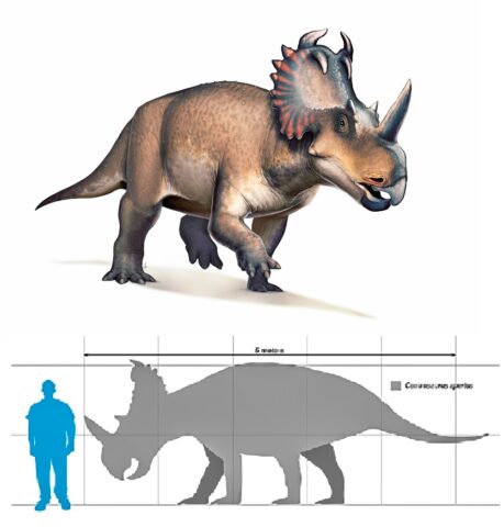 백악기 때 북미에 서식했던 초식 공룡 센트로사우루스와 사람의 크기 비교. © WikiCommons / Fred Wierum / User: Slate Weasel
