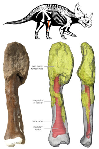 캐나다 로열 온타리오 박물관(ROM)과 맥매스터대 공동 연구팀은 7600만 년~7700만 년 전에 살았던 초식 공룡 센트로사우루스(Centrosaurus apertus)의 정강이 화석 뼈에서 공격적인 악성 종양인 골육종의 흔적을 발견해 의학저널 ‘랜싯 종양학(Lancet Oncology)’ 3일 자에 발표했다.