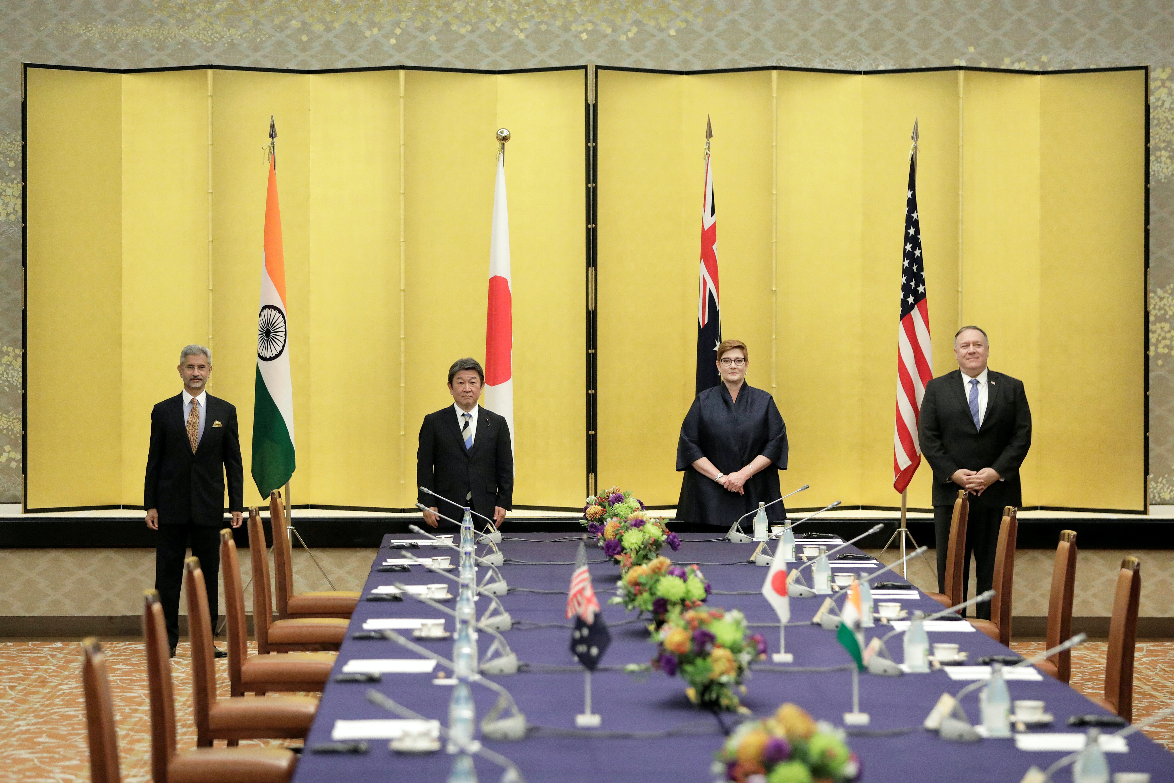 10月6日美國國務卿蓬佩奧(右一)與日本外務大臣茂木敏充(左二),印度外長蘇傑生(左一),澳洲外長潘恩(右二)舉行【四方安全會談】(Twitter @Secretary Pompeo)
