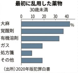 覚醒剤の使用経験がある30歳未満の受刑者のうち、最初に乱用した薬物が大麻だった割合が4割を占めることが、24日公表の「2020年版犯罪白書」で分かった。大麻が若者の薬物依存の「ゲートウエー(入り口)ドラッグ」となっている実態が改めて浮かび上がった。
