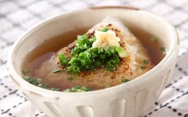 和風出汁の中にこんがり焼けたおにぎりをイン。崩しながら、お茶漬けのようにいただきます。これなら胃腸への負担も減り、お米がスープでふやけて満腹感もアップ。冷凍焼きおにぎりをアレンジしても良いですね。